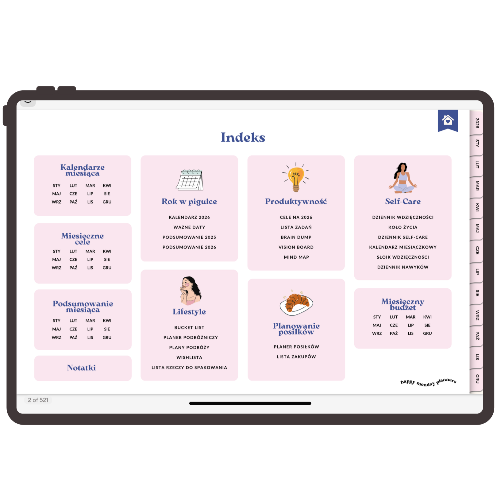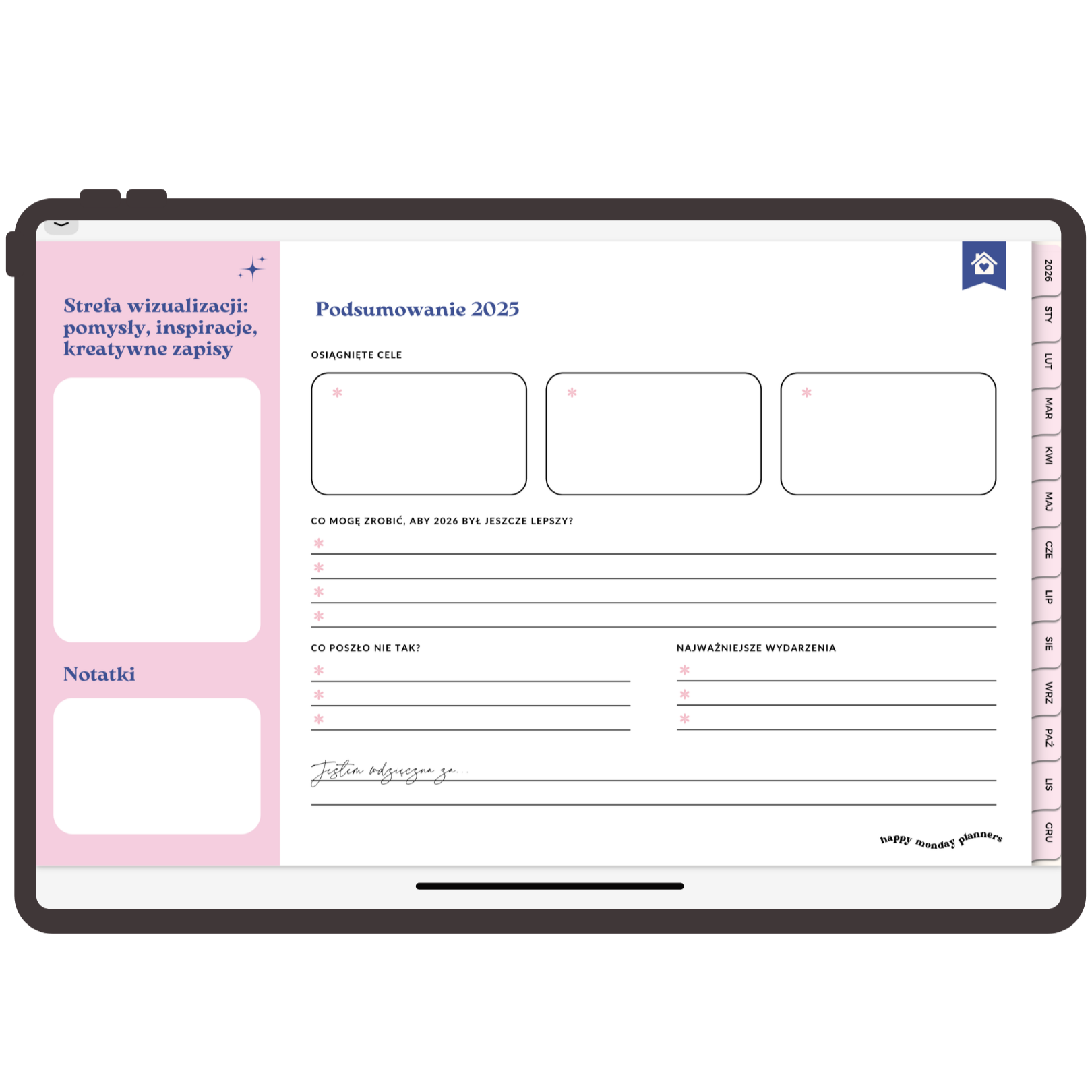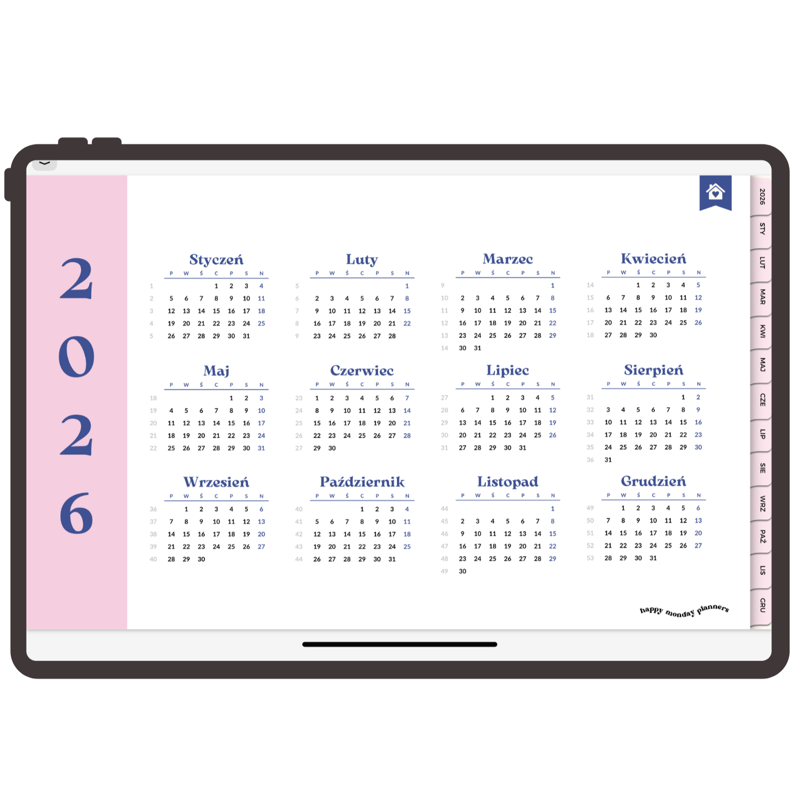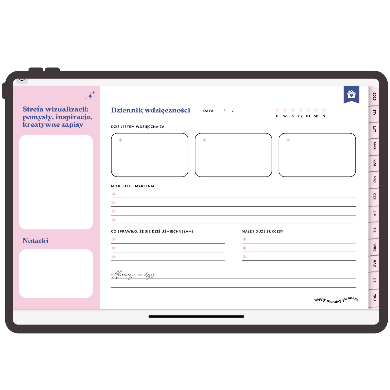 Zorganizuj swoje życie, wyznaczaj cele i realizuj marzenia z cyfrowym planerem na 2026 rok! Stworzony przez najlepszych programistów, poziomy Planer Happy Monday zawiera aż 520 stron i 20 tysięcy klikalnych dat i przycisków umożliwiających łatwą nawigację od stycznia do grudnia 2026. Zmieściliśmy tu wszystko, co nie zmieściłoby się w klasycznym planerze papierowym! Ten planer to 3 w 1: zawiera 365 stron do planowania dziennego, ale znajdziesz tu też planery tygodniowe oraz miesięczne, tak abyś mogła wybrać to, co najlepiej pasuje do Twoich potrzeb. Ikona „home” umożliwia powrót do indeksu z każdej strony.