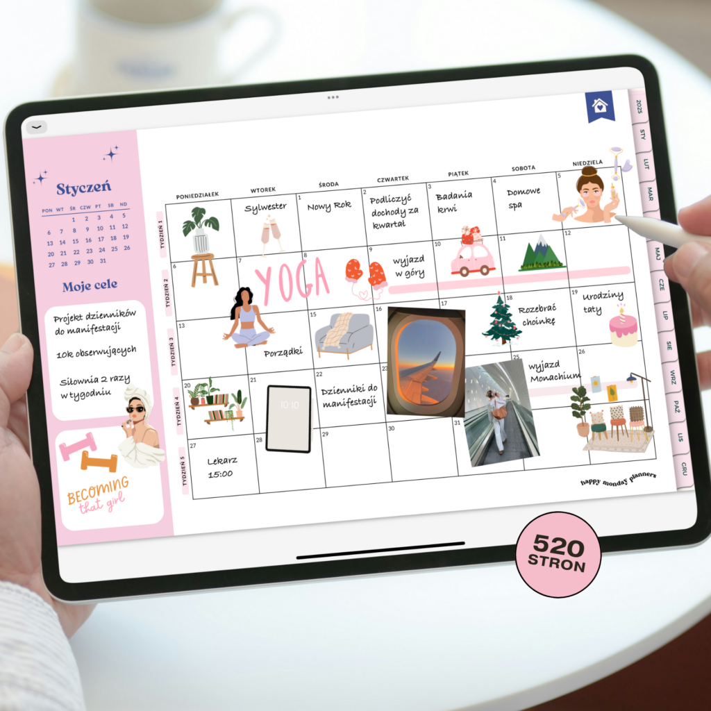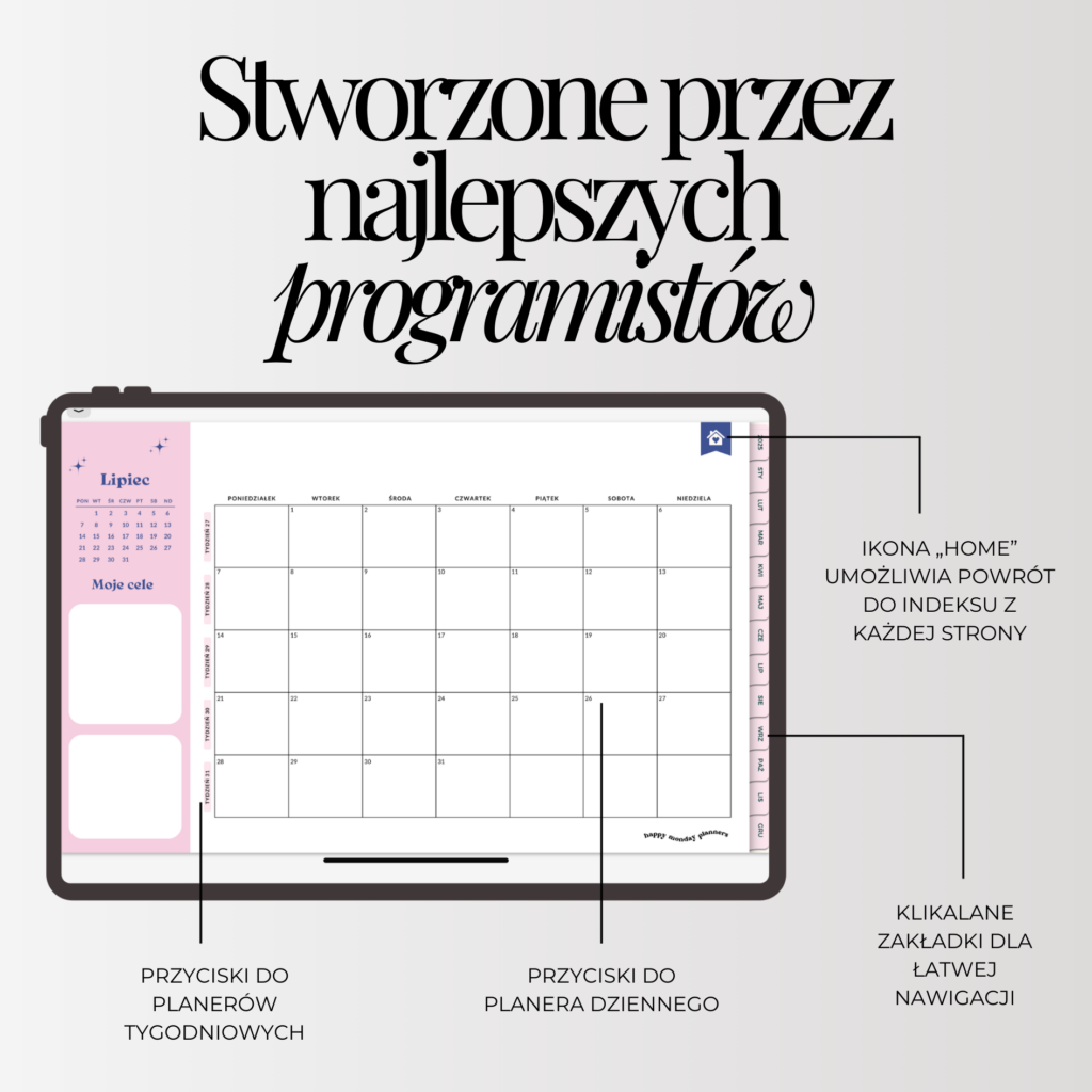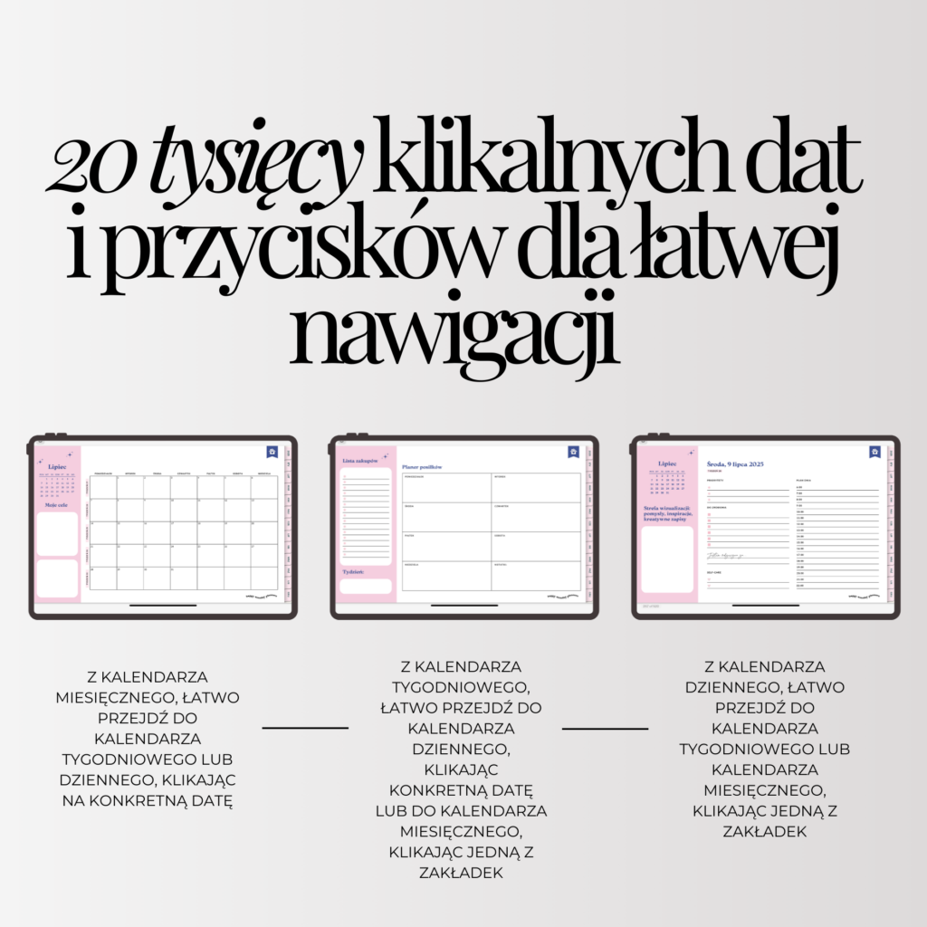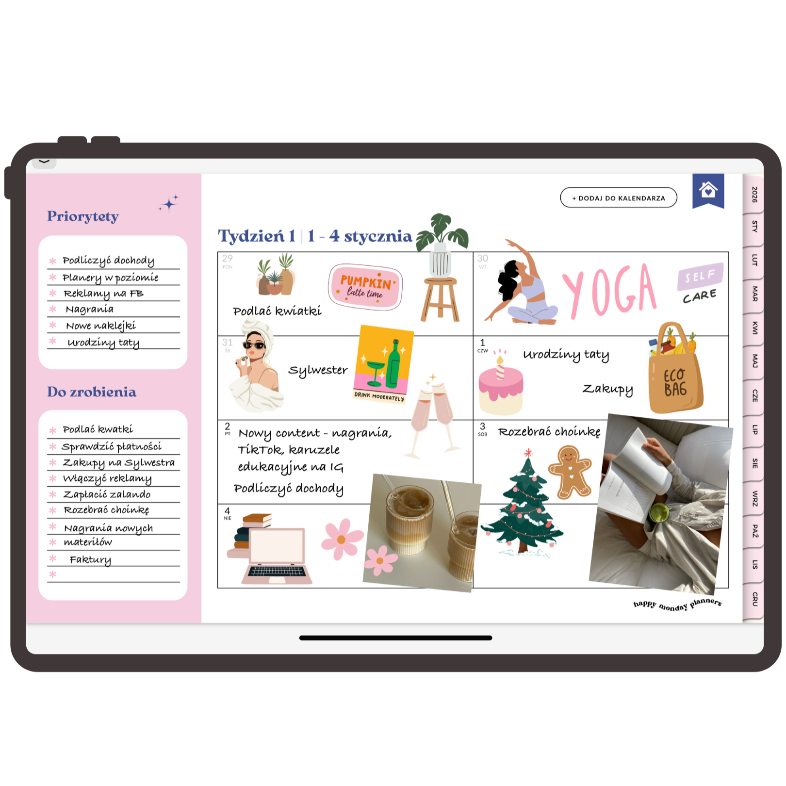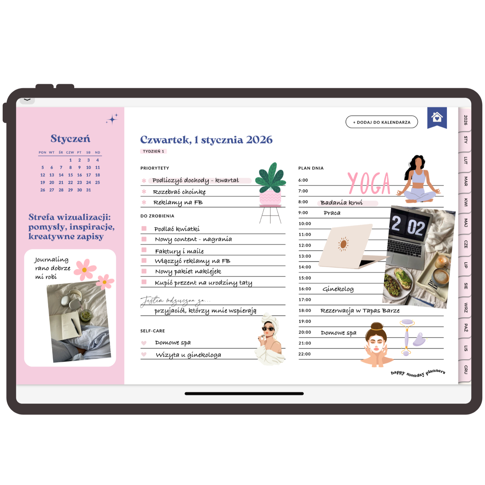 Zorganizuj swoje życie, wyznaczaj cele i realizuj marzenia z cyfrowym planerem na 2026 rok! Stworzony przez najlepszych programistów, poziomy Planer Happy Monday zawiera aż 520 stron i 20 tysięcy klikalnych dat i przycisków umożliwiających łatwą nawigację od stycznia do grudnia 2026. Zmieściliśmy tu wszystko, co nie zmieściłoby się w klasycznym planerze papierowym! Ten planer to 3 w 1: zawiera 365 stron do planowania dziennego, ale znajdziesz tu też planery tygodniowe oraz miesięczne, tak abyś mogła wybrać to, co najlepiej pasuje do Twoich potrzeb. Ikona „home” umożliwia powrót do indeksu z każdej strony.