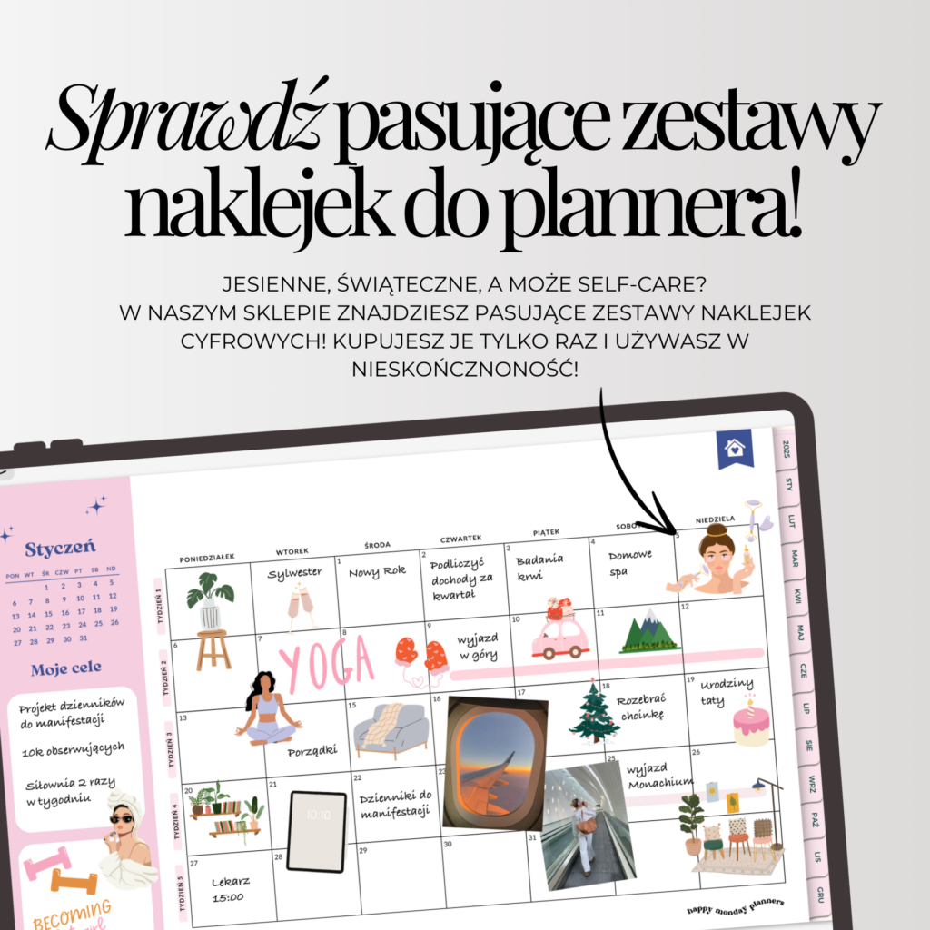 W planerze cyfrowym możesz dodawać zdjęcia, ilustracje oraz korzystać z cyfrowych naklejek, które można używać bez ograniczeń – raz kupione, mogą być stosowane wielokrotnie, co jest dużo bardziej ekonomiczne niż klasyczne naklejki papierowe.