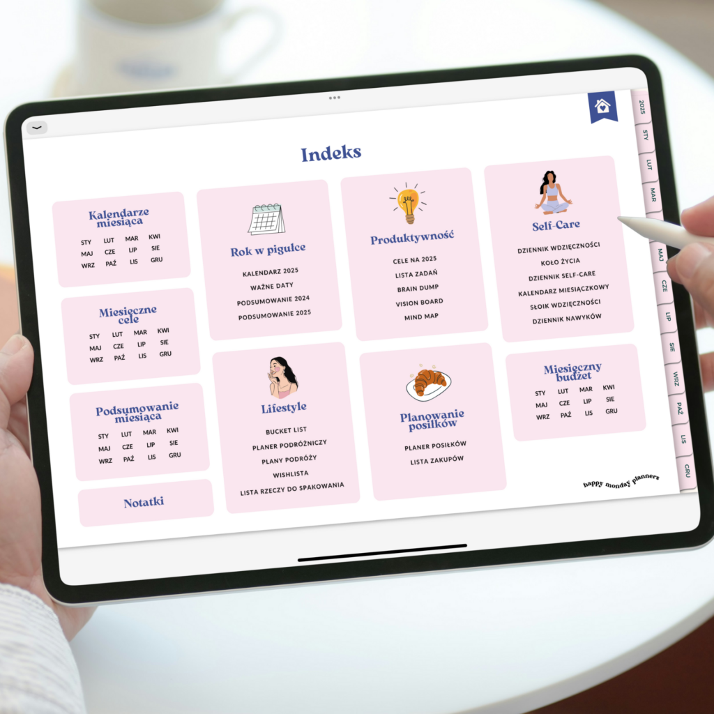 Znajdziesz tu między innymi dziennik wdzięczności, planer posiłków, dziennik nawyków, checklisty self-care, miesięczny budżet, vision board, miesięczne cele, planer podróży i wiele innych przydatnych narzędzi! Masz do nich łatwy dostęp z poziomu indeksu, a każdą stronę możesz skopiować dowolną ilość razy!