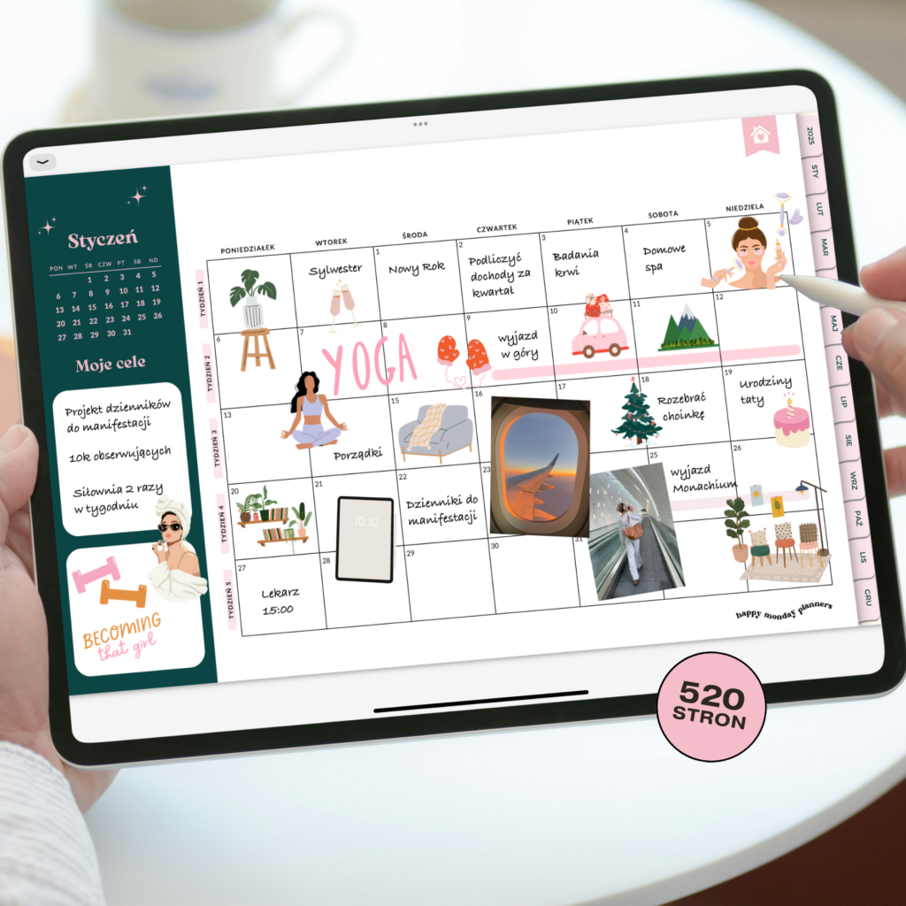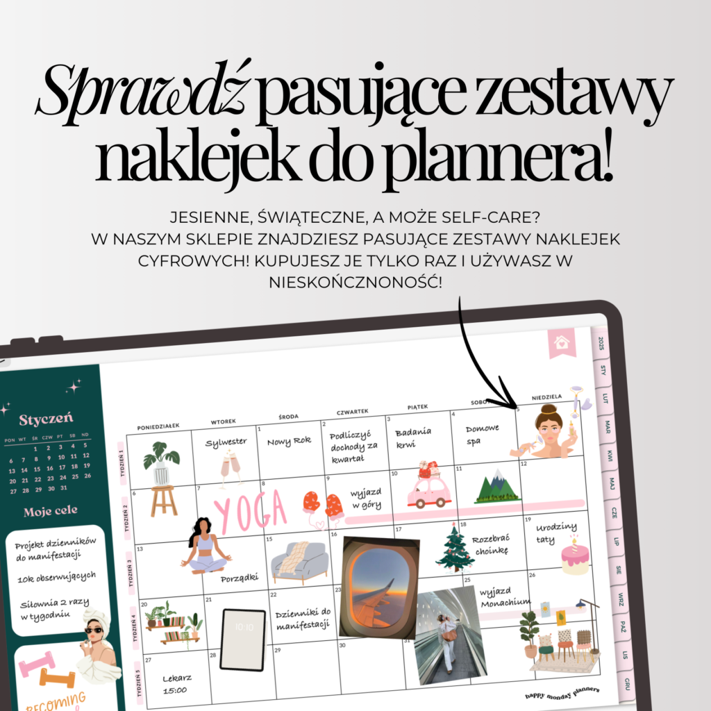 W planerze cyfrowym możesz dodawać zdjęcia, ilustracje oraz korzystać z cyfrowych naklejek, które można używać bez ograniczeń – raz kupione, mogą być stosowane wielokrotnie, co jest dużo bardziej ekonomiczne niż klasyczne naklejki papierowe.