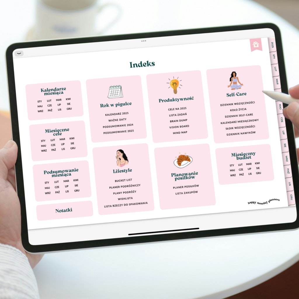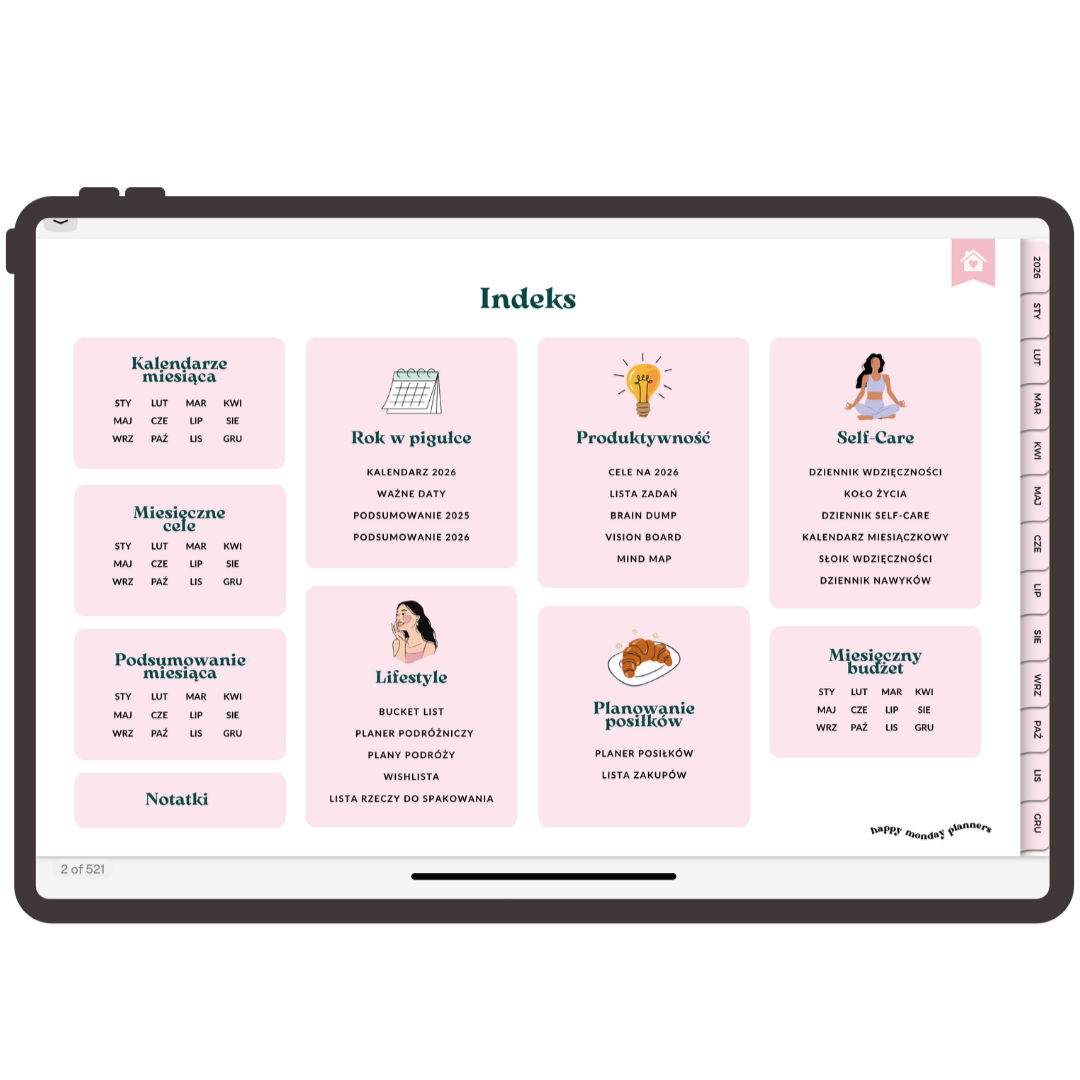 Znajdziesz tu między innymi dziennik wdzięczności, planer posiłków, dziennik nawyków, checklisty self-care, miesięczny budżet, vision board, miesięczne cele, planer podróży i wiele innych przydatnych narzędzi! Masz do nich łatwy dostęp z poziomu indeksu, a każdą stronę możesz skopiować dowolną ilość razy!