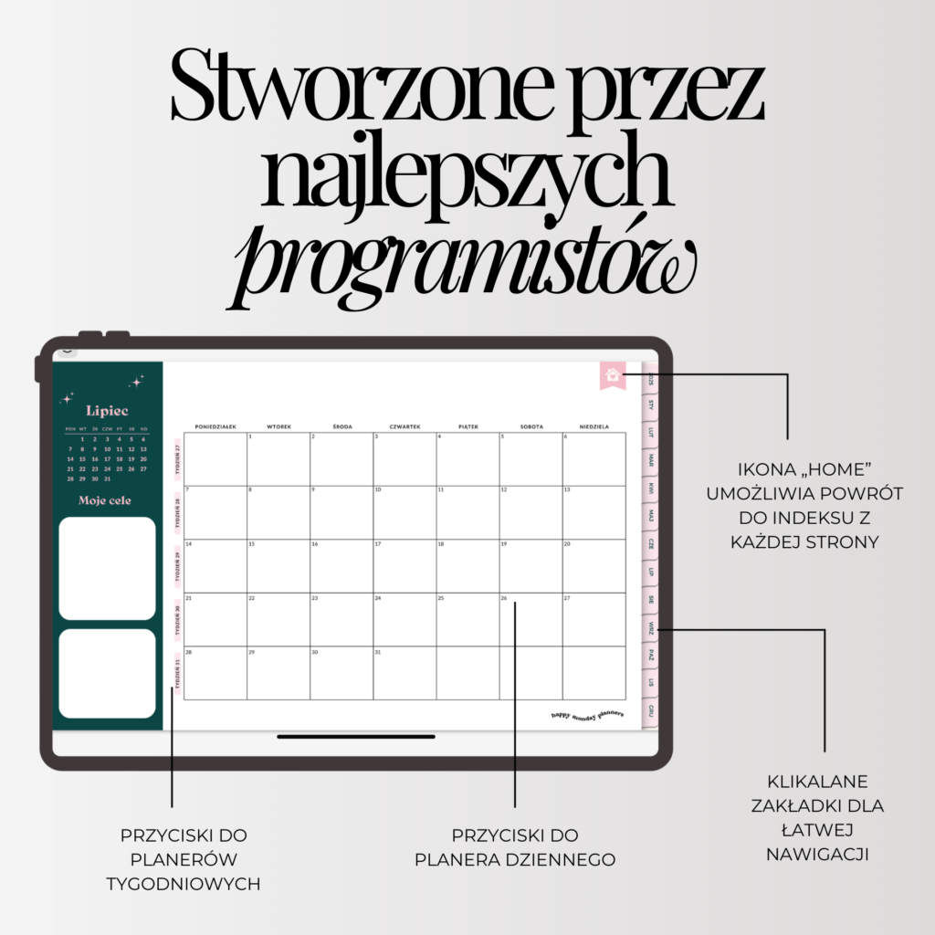Planery HappyMonday zostały stworzone przez programistów, tak aby każda data była klikalna i przenosiła Cię do odpowiedniej strony! W naszych planerach poziomych znajdziesz aż 20 tysięcy takich przycisków. To unikalny produkt, nad którego stworzeniem pracowaliśmy ponad rok!