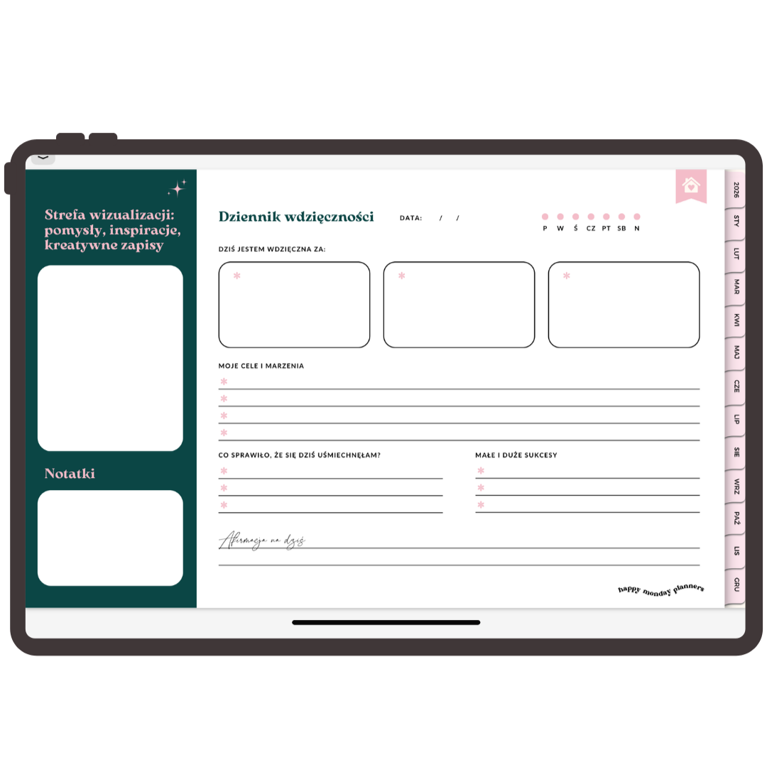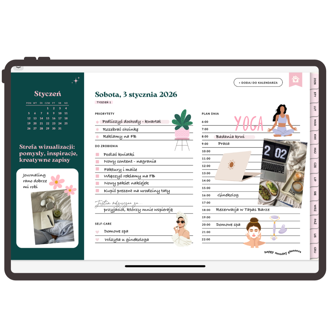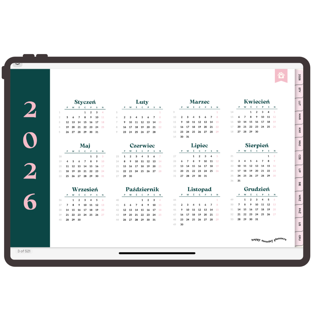 Zorganizuj swoje życie, wyznaczaj cele i realizuj marzenia z cyfrowym planerem na 2026 rok! Stworzony przez najlepszych programistów, poziomy Planer Happy Monday zawiera aż 520 stron i 20 tysięcy klikalnych dat i przycisków umożliwiających łatwą nawigację od stycznia do grudnia 2026. Zmieściliśmy tu wszystko, co nie zmieściłoby się w klasycznym planerze papierowym! Ten planer to 3 w 1: zawiera 365 stron do planowania dziennego, ale znajdziesz tu też planery tygodniowe oraz miesięczne, tak abyś mogła wybrać to, co najlepiej pasuje do Twoich potrzeb. Ikona „home” umożliwia powrót do indeksu z każdej strony.
