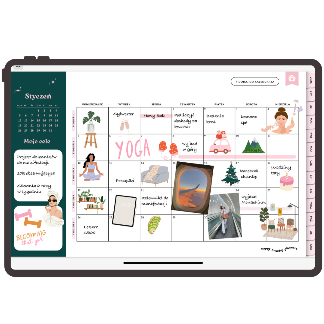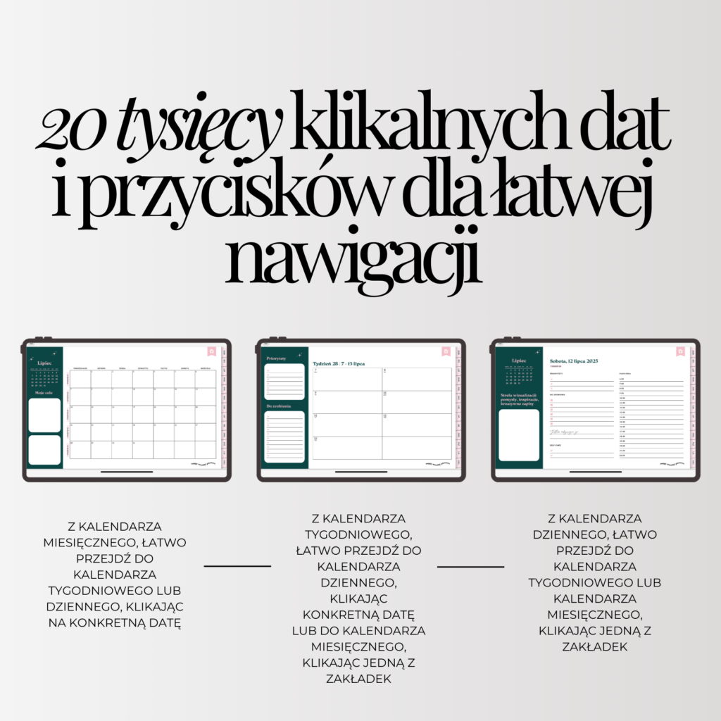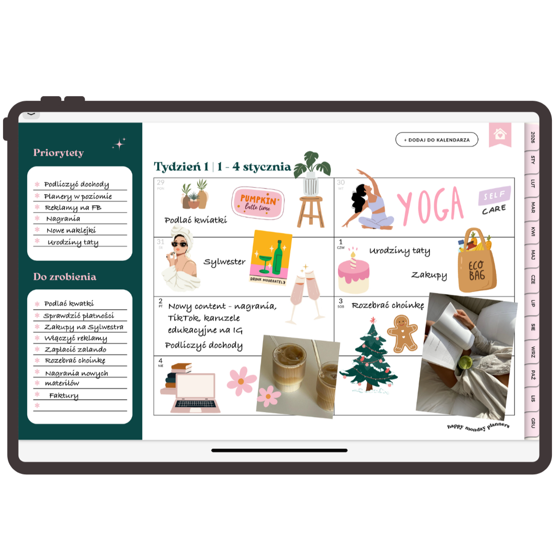 Zorganizuj swoje życie, wyznaczaj cele i realizuj marzenia z cyfrowym planerem na 2026 rok! Stworzony przez najlepszych programistów, poziomy Planer Happy Monday zawiera aż 520 stron i 20 tysięcy klikalnych dat i przycisków umożliwiających łatwą nawigację od stycznia do grudnia 2026. Zmieściliśmy tu wszystko, co nie zmieściłoby się w klasycznym planerze papierowym! Ten planer to 3 w 1: zawiera 365 stron do planowania dziennego, ale znajdziesz tu też planery tygodniowe oraz miesięczne, tak abyś mogła wybrać to, co najlepiej pasuje do Twoich potrzeb. Ikona „home” umożliwia powrót do indeksu z każdej strony.