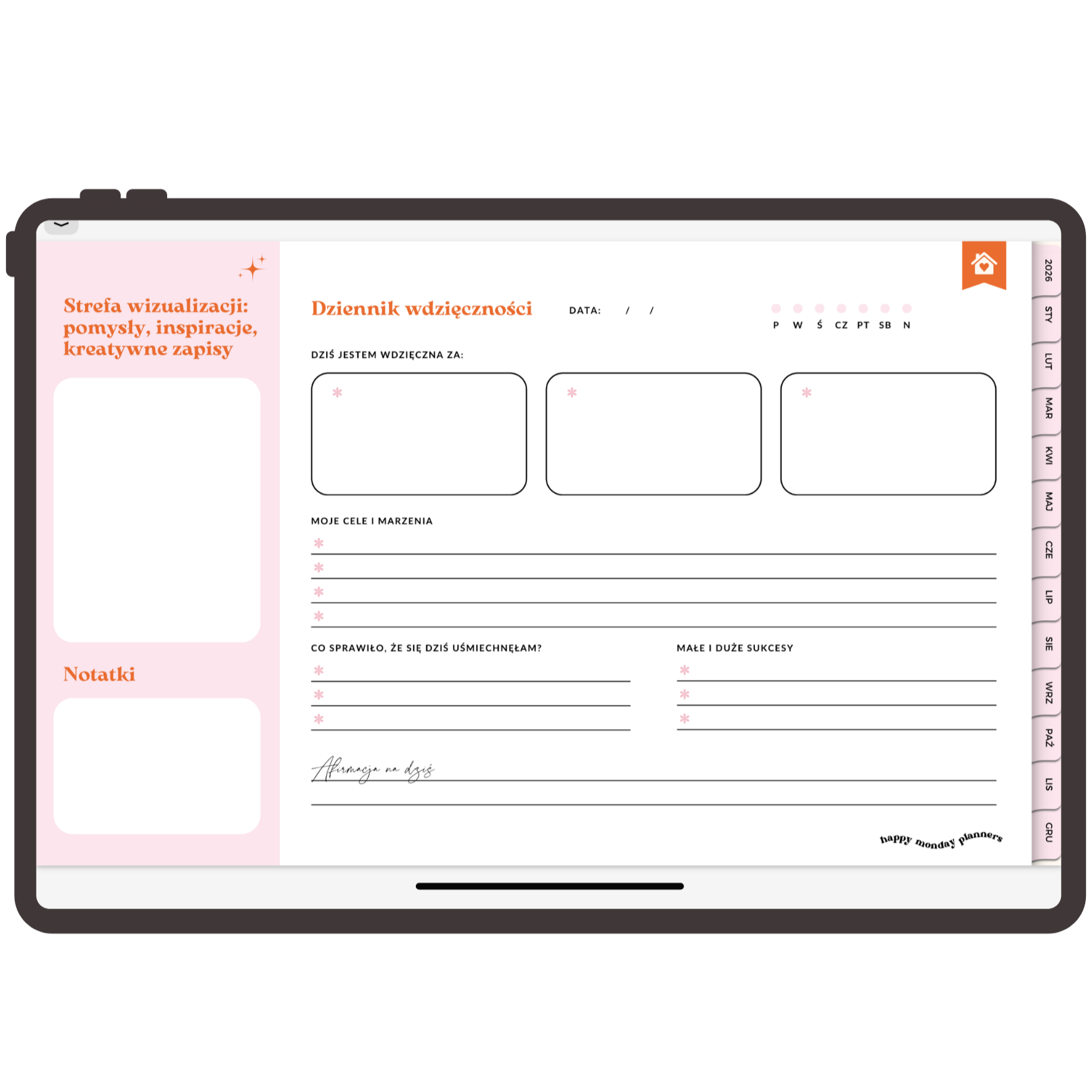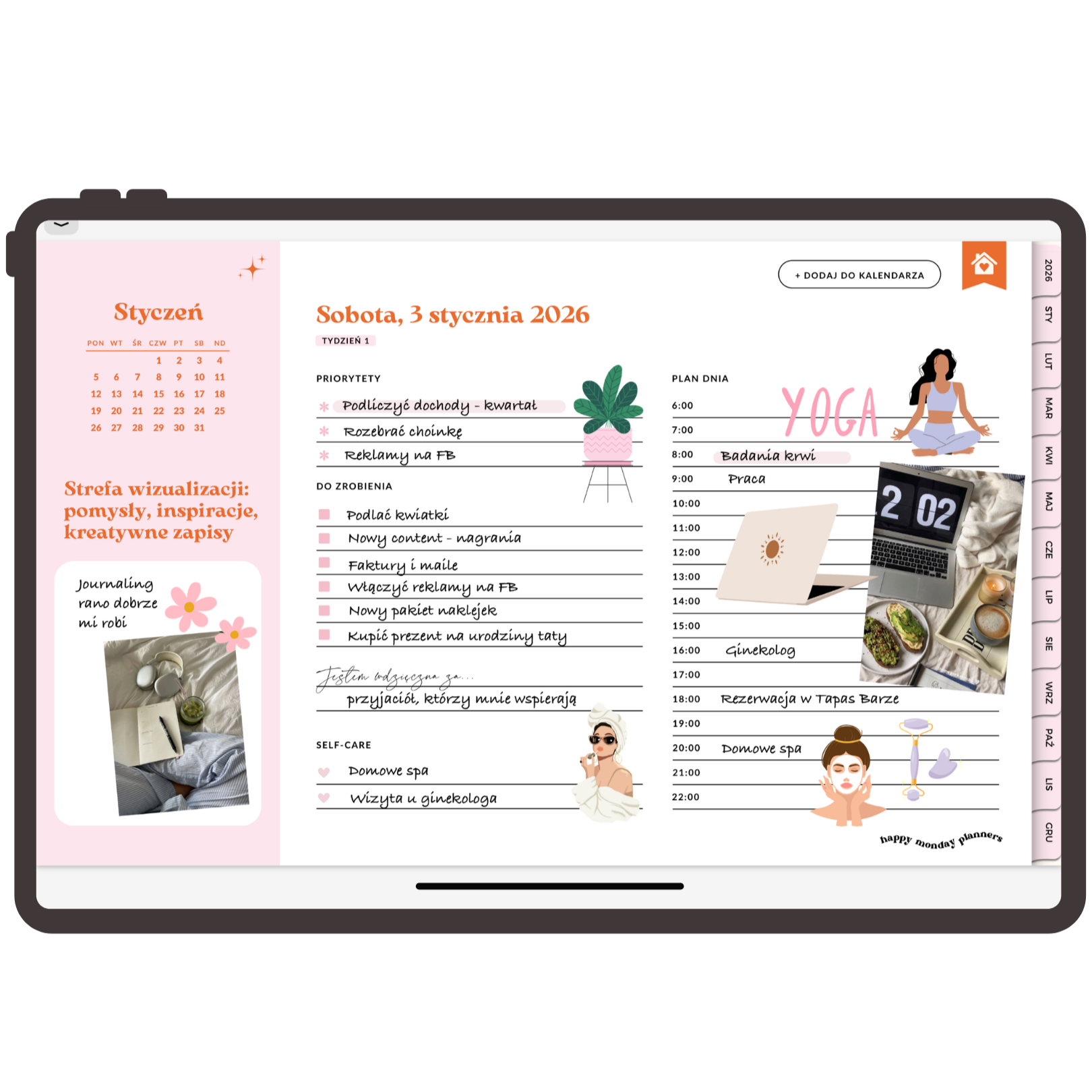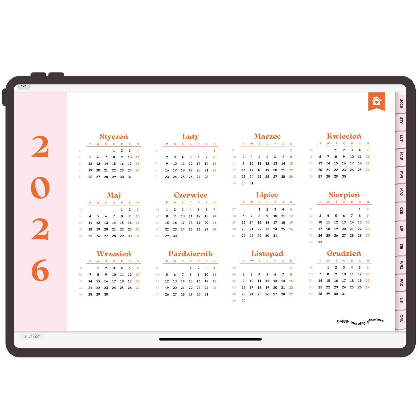 Zorganizuj swoje życie, wyznaczaj cele i realizuj marzenia z cyfrowym planerem na 2026 rok! Stworzony przez najlepszych programistów, poziomy Planer Happy Monday zawiera aż 520 stron i 20 tysięcy klikalnych dat i przycisków umożliwiających łatwą nawigację od stycznia do grudnia 2026. Zmieściliśmy tu wszystko, co nie zmieściłoby się w klasycznym planerze papierowym! Ten planer to 3 w 1: zawiera 365 stron do planowania dziennego, ale znajdziesz tu też planery tygodniowe oraz miesięczne, tak abyś mogła wybrać to, co najlepiej pasuje do Twoich potrzeb. Ikona „home” umożliwia powrót do indeksu z każdej strony.