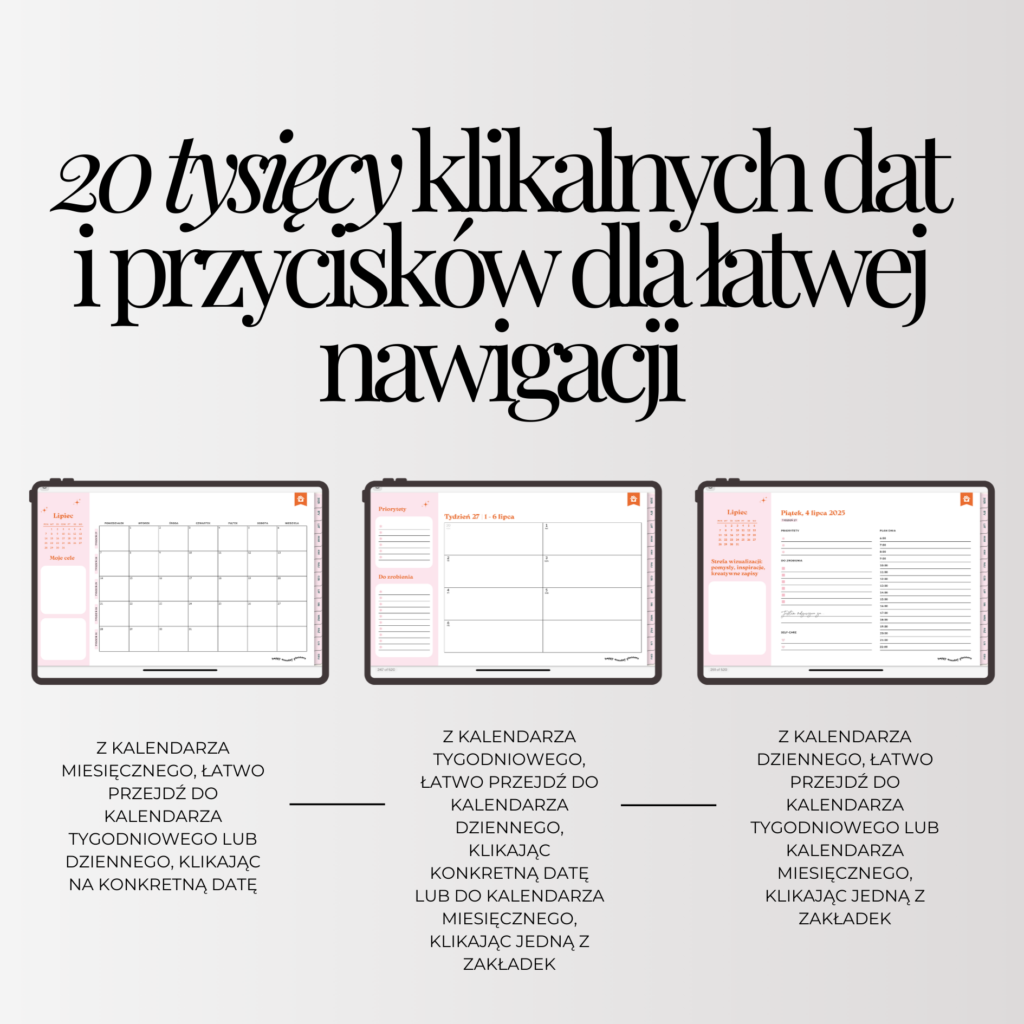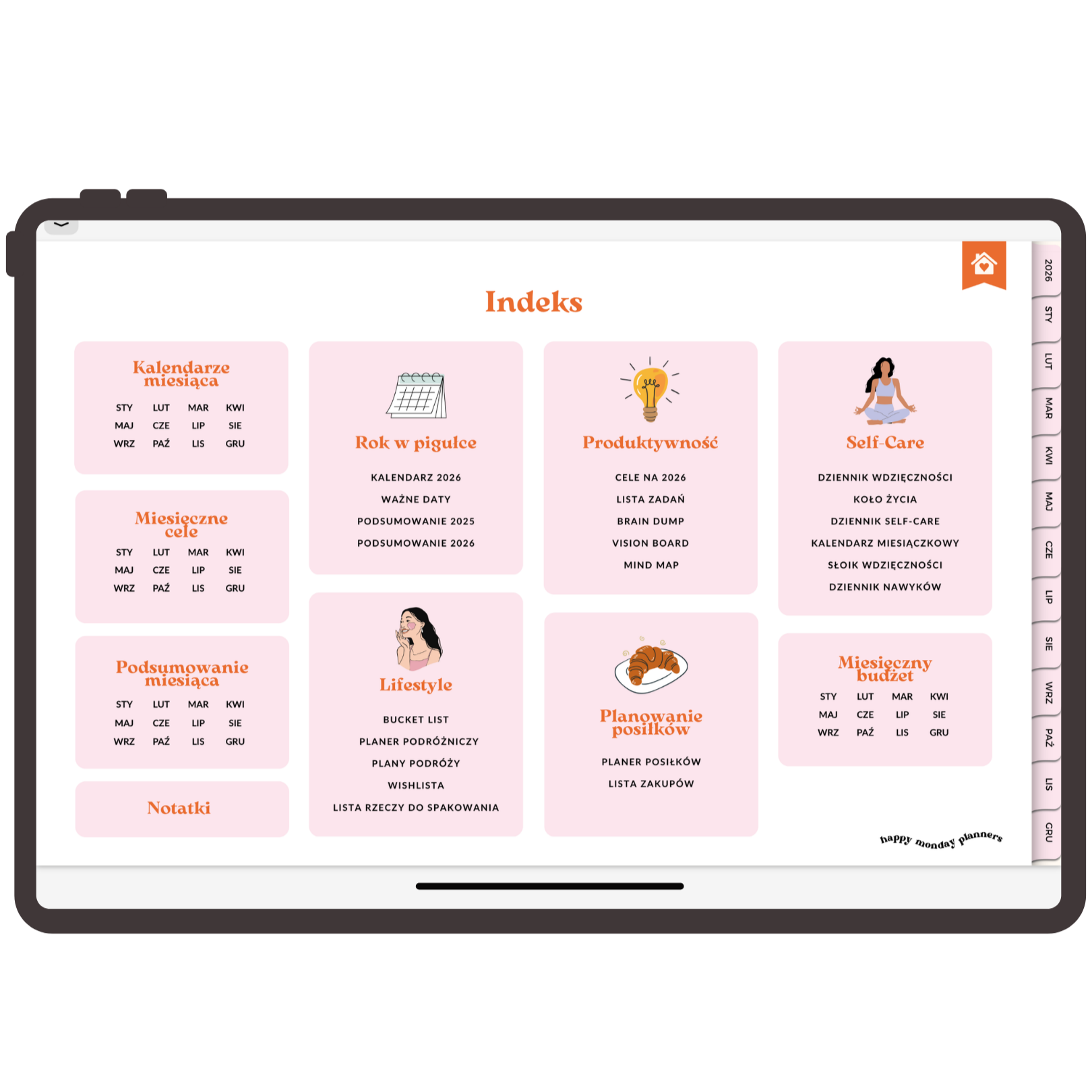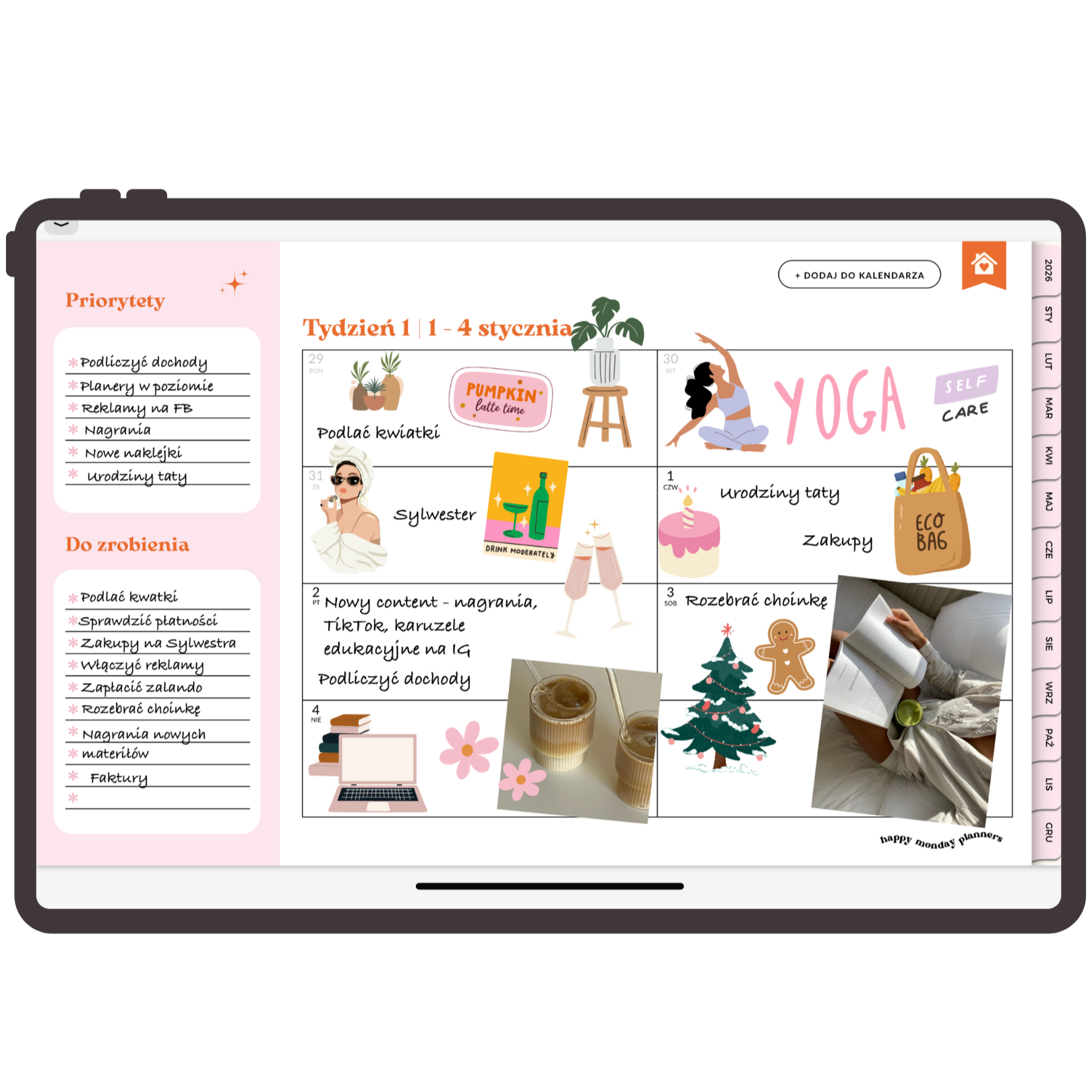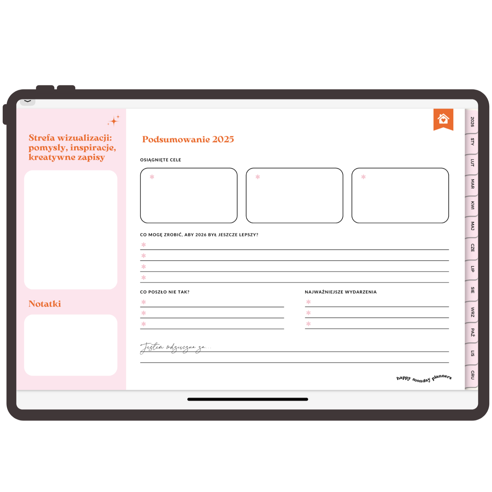 Zorganizuj swoje życie, wyznaczaj cele i realizuj marzenia z cyfrowym planerem na 2026 rok! Stworzony przez najlepszych programistów, poziomy Planer Happy Monday zawiera aż 520 stron i 20 tysięcy klikalnych dat i przycisków umożliwiających łatwą nawigację od stycznia do grudnia 2026. Zmieściliśmy tu wszystko, co nie zmieściłoby się w klasycznym planerze papierowym! Ten planer to 3 w 1: zawiera 365 stron do planowania dziennego, ale znajdziesz tu też planery tygodniowe oraz miesięczne, tak abyś mogła wybrać to, co najlepiej pasuje do Twoich potrzeb. Ikona „home” umożliwia powrót do indeksu z każdej strony.